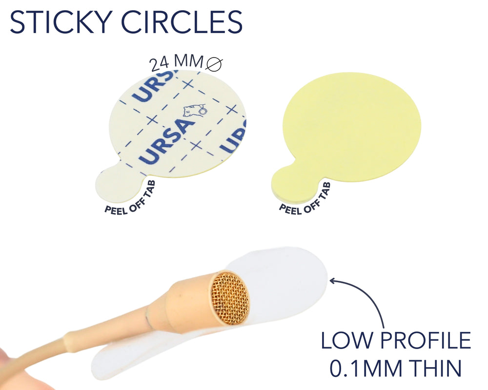 URSA Sticky Circles provide secure, discreet mic placement under clothing or directly on skin. At just 0.4 mm thickand 24 mm in diameter, they are see-through, low-profile and designed for quick, reliable use on set.